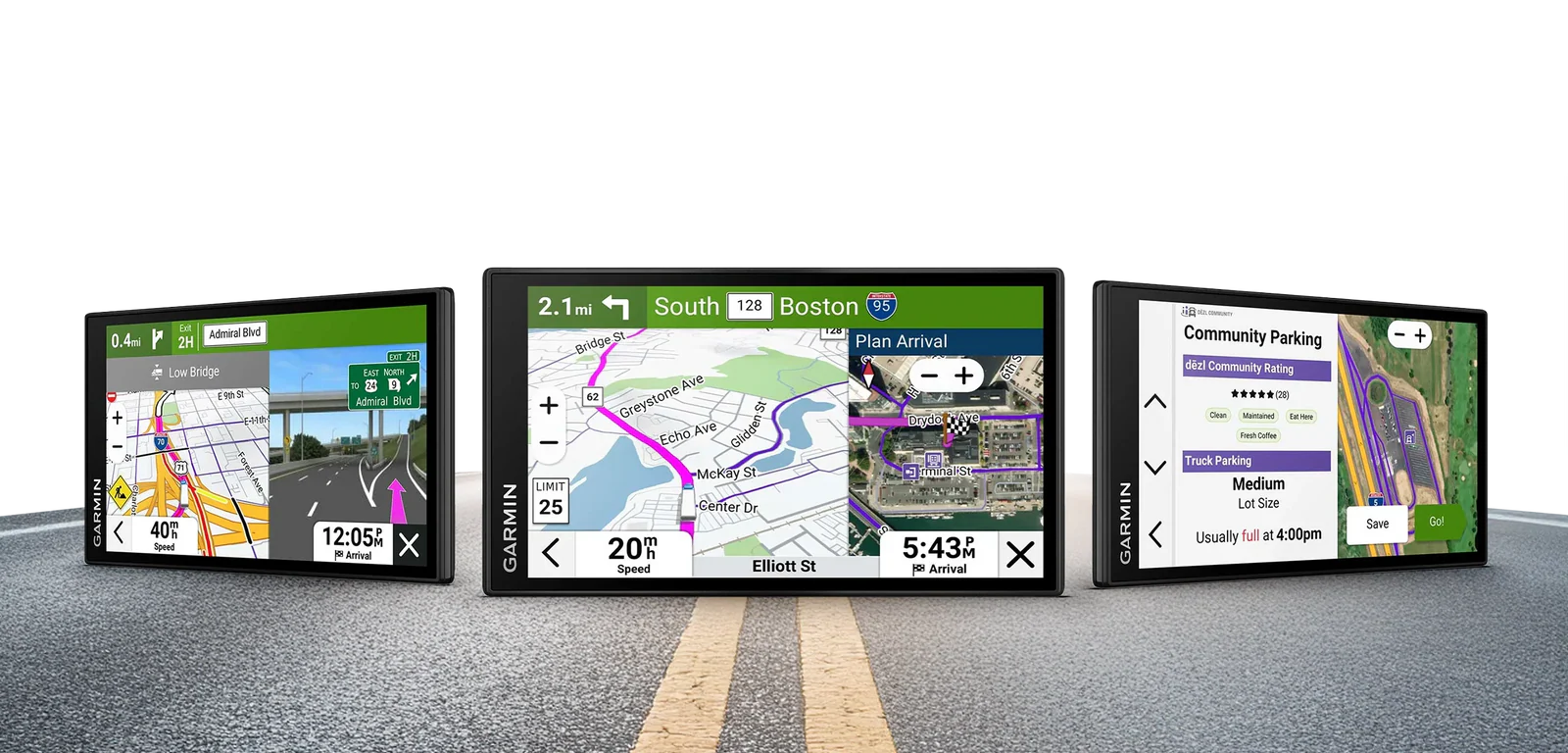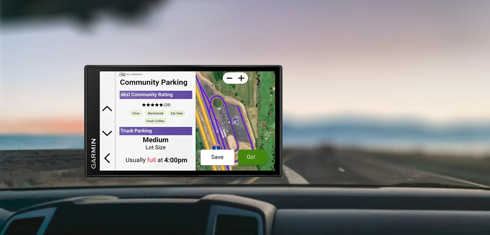 Need to park your rig? When connected to the dēzl app, you can view truck-specific parking options at truck stops and rest areas along your route.