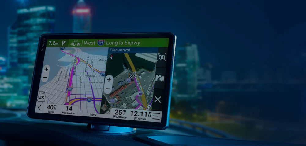With its bright, crisp 10” touchscreen display, this dēzl truck navigator is designed for easy in-cab viewing and intuitive operation. Enjoy the option of displaying your navigation screen in landscape or portrait mode.